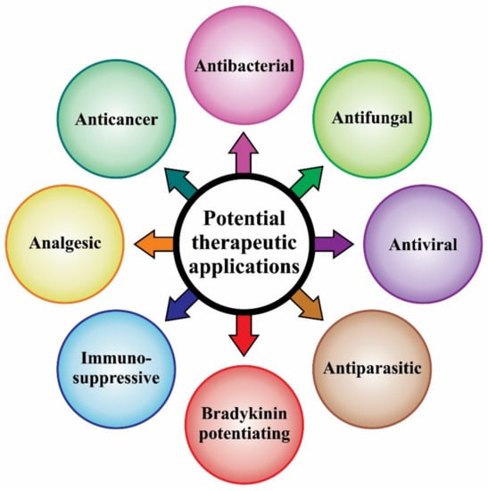 It is widely reported in the literature that scorpion venom is a rich source of bioactive compounds, and as such, their toxins are of interest to the pharmaceutical and biotech industries []. However, despite the fact that substantial research efforts are ongoing and the prospects for scorpion-derived therapeutic peptides are very promising, chlorotoxin is the only toxin from scorpion venom that has been taken into clinical trials []. Moreover, no scorpion toxin-based drug is currently found in the market []. In this section, potential applications of scorpion venom compounds, which have been the subject of therapeutic research, are presented (Figure 4), with a focus on results recently reported in the scientific literature. A comprehensive overview of such compounds, including older research reports, can be found elsewhere [].