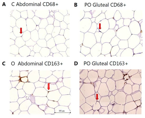 Representative images of macrophage infiltration in different subjects from PO, O, and C of CD68+ (a,b) and CD163+ (c,d) cells in subcutaneous abdominal and gluteal adipose tissue depots, respectively. The red arrows point to a positive staining of the corresponding marker.