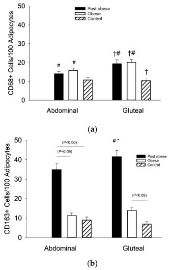 The content of CD68+ cells was higher (p < 0.05) in the gluteal compared to the abdominal depot (Figure 2a). In both adipose tissue depots, Post obese and Obese had a higher (p < 0.05) content of CD68+ cells than Controls.