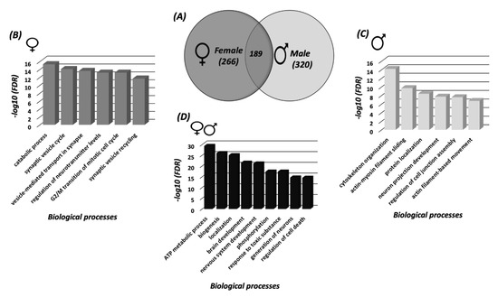 Furthermore, in order to investigate the shared processes and mechanisms between both sexes, BP analysis was conducted to identify the SNOed proteins common to both female and male cortices. The analysis indicated a significant enrichment of processes that are functionally related to mitochondria and neurodevelopment, such as ATP metabolic processes (FDR = 4.6 × 10−30), nervous system development (FDR = 7.31 × 10−22), generation of neurons (FDR = 2.45 × 10−15) and others (See Figure 1D).