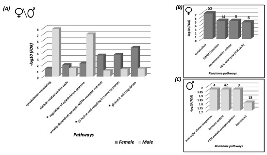 To test the pathways affected by proteins networks, reactome pathways analysis was performed. Reactome pathway refers to the networks of biological and molecular interactions by which the proteins clusters can form. In the female cortex, the enriched reactome pathways were consistent with the BP and pathways analysis. For example, “Metabolism” (n = 53, FDR = 1.36 × 10−7), “Neurotransmitter release cycle” (n = 8, FDR = 1.43 × 10−5), and others (Figure 2B). In the male cortex, the analysis revealed significant enrichment of “immune system” (n = 42, FDR = 0.0109), “Post-translational modification (PTM) protein phosphorylation” (n = 9, FDR = 0.0109), and others (Figure 2C).