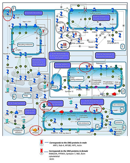 Pathways analysis of the SNO proteins of each tested group was conducted in order to test the shared signaling pathways that are affected and controlled by SNO in both sexes. The pathways analysis was consistent with the BP analysis of the females and males and showed significant involvement of the SNO proteins in synaptic and cytoskeleton-associated pathways (Figure 2A). For example, “Clathrin-coated vesicle cycle” pathway was significantly enriched with FDR = 0.01146. The “regulation of cytoskeleton proteins in oligodendrocyte differentiation and myelination“ pathway was significantly enriched with FDR = 9.8 × 10−8. It is worth mentioning that despite both pathways were enriched in both sexes, different proteins were involved in the signaling regulation. The detailed cell trafficking of both signaling pathways are shown in Figure 3 and Figure 4.