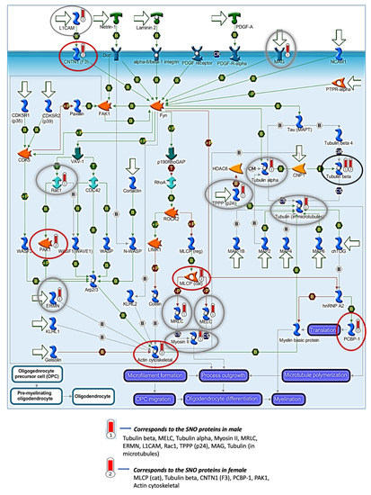 “Regulation of cytoskeleton proteins in oligodendrocyte differentiation and myelination” pathway was enriched in both sexes. Red circles are SNO proteins in female. Gray circles are SNO proteins in male. Black circles are SNO proteins in both female and male.