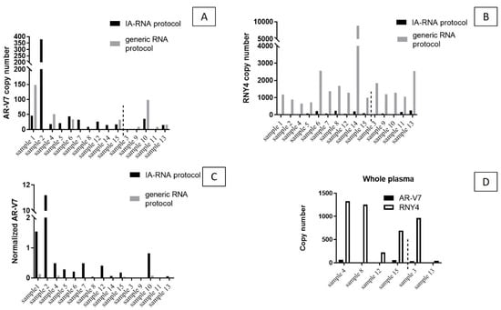 The AR-V7 transcript (Figure 1A) was detected in 12/15 samples (80%) purified using the IA-RNA protocol (8.7–377.7 copies/mL; an average of 4.6 for all samples and 54.4 for positive ones); in 8/15 (53%) samples isolated with the generic extraction protocol (6–147.6 copies/mL; an average of 26.4 for all samples, 49.5 in AR-V7+ ones) and in 7/15 (46.6%) samples purified with the PA-RNA protocol (12.2–209.5 copies/mL; an average of 28.7 for all samples and 61.5 for positive ones).