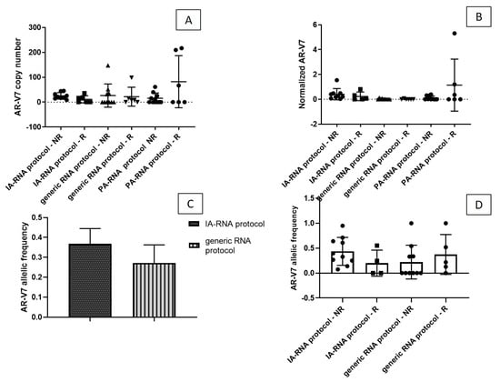 There was an increase in AR-V7 allelic frequency following the IA-RNA protocol (average of 36%) compared to the benchmark generic kit (average of 27%—Figure 2C). There was an average AR-V7 allelic frequency of 45.4% in the NR samples and 20% in the R samples after IA isolation and average values of 22% and 37.2% were detected in the NR and the R samples, respectively, after generic extraction (Figure 2D).The detection of AR-FL showed the same trend observed for AR-V7; an average of 55.5 copies/mL were detected with the IA-RNA protocol, 235 copies/mL with the PA-RNA protocol, and 133.5 copies/mL with the generic kit; an average of 206.2 copies/mL were detected in whole plasma (Figure 3A–C, respectively).