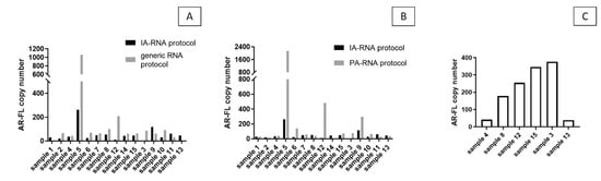 (A) AR-FL copies/mL identified with IA-RNA protocol vs. generic protocol, (B) with IA-RNA protocol vs. PA-RNA protocol and (C) in whole plasma in a subset of samples.