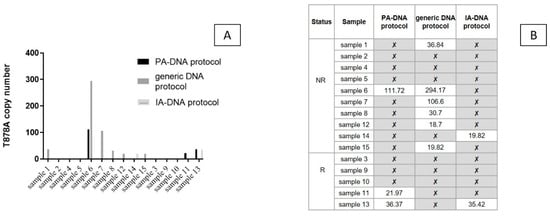 (A) AR T878A copies/mL identified with the column-based DNA purification (PA-DNA) protocol, the generic DNA protocol Kit and the IA-A protocol. (B) Results of the isolation for detection (with mutation copies/mL plasma)/non detection (✘) of the point mutation.