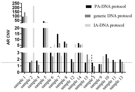 AR amplification was detectable with the PA-DNA protocol and the QIAamp Circulating Nucleic Acid extraction kit in 12/15 samples (80%). The PA-DNA protocol returned borderline values (1.49 and 1.48) for two of the three negative samples (samples 3 and 15); the IA-DNA protocol returned positive results in 8/11 (72.7%) samples (data for four samples were not available because of technical problems) (Figure 5).