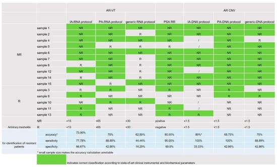 The IA-RNA protocol distinguished NRs from Rs better than the generic extraction method. With the IA-RNA protocol, all 10 NR samples were AR-V7+ (average of 60.4 copies/mL plasma) while among the five R samples, two were positive and three were AR-V7− (average of 10.1 copies/mL plasma).