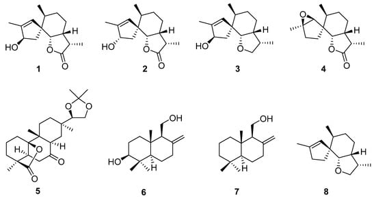 - Wang, S.R.; Zhang, L.; Chen, H.P.; Li, Z.H.; Dong, Z.J.; Wei, K.; Liu, J.K. Four new spiroaxane sesquiterpenes and one new rosenonolactone derivative from cultures of Basidiomycete Trametes versicolor. Fitoterapia 2015, 105, 127–131. [Google Scholar] [CrossRef] [PubMed]