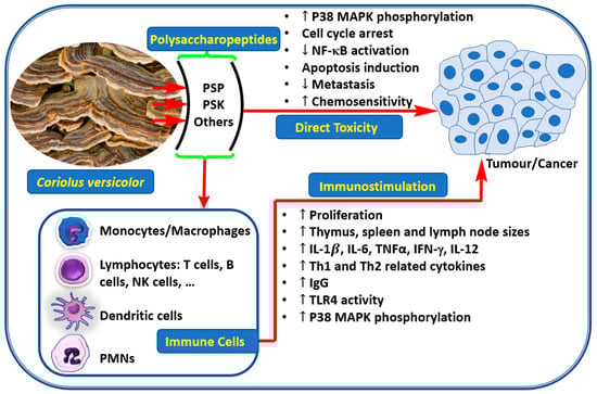 Overall, the polysaccharides of C. versicolor have been shown to induce direct cell growth inhibitory effect and apoptosis in cancer cells. Cell cycle arrest, even in some cases at concentrations lower than 100 µg/mL in vitro, has been observed. This moderate level of activity should be considered significant since the active components are large molecular weight compounds or mixtures. Given that carbohydrates taken through the oral route are subjected to hydrolysis by intestinal enzymes, there is always a question of whether they could maintain their therapeutic value in vivo. Interestingly, C. versicolor polysaccharides, including PSP and PSK, have been shown to demonstrate anti-cancer effect in vivo following oral administration. The other well-established mechanism of the anti-cancer effect by C. versicolor is via immunostimulant action, as evidenced by their ability to increase the production of cytokines such as IL-12, which is Th1 related. Th-lymphocyte subsets, including Th1, Th2, Th17 or Treg, mainly through the production of key cytokines and lymphocyte subsets (B-cells, CD4+ and CD8+ T-cells, NK cells, and different stages of differentiated T-cells), have been extensively studied for their response to C. versicolor polysaccharides. The further induction of cytokines such as IFN-γ in T cells was evident, which, together with TNF-α, induce cancer/tumour killing. Other cytokines, including IL-1 and IL-6, have been shown to be augmented by the polysaccharides. All these events appear to enhance antibody production in T-cells while enhancing the activity of other mononuclear cells, including monocytes/macrophages.