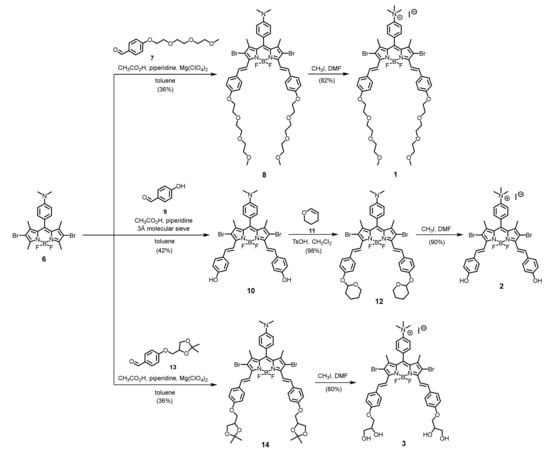 Synthesis of mono-cationic distyryl boron dipyrromethenes (BODIPYs) 1–3.