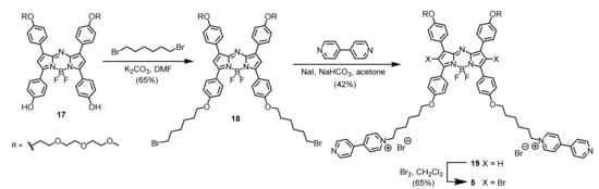 To study the effect of cationic moieties on the aPDT efficiency, we also prepared two dicationic analogues (compounds 4 and 5). As shown in Scheme 2, treatment of the previously reported BODIPY 15 with 4-[3-(diethylamino)propoxy]benzaldehyde (16) under typical reaction conditions of Knoevenagel condensation resulted in the formation of the distyryl BODIPY intermediate product, which was not purified and N-methylated directly in THF to give the dicationic analogue 4. Apart from distyryl BODIPYs, we also studied the aza-BODIPY derivatives that are also promising near-infrared-absorbing photosensitizers []. The synthetic route used to prepare the aza-BODIPY analogue 5 is shown in Scheme 3. O-Alkylation of compound 17 with an excess of 1,6-dibromohexane in the presence of K2CO3 in DMF led to the formation of compound 18, which underwent further nucleophilic substitution with 4,4′-dipyridine in the presence of NaI and NaHCO3 in acetone to afford the dicationic analogue 19. Finally, bromination of compound 19 using bromine in CH2Cl2 gave the expected product 5. The introduction of these heavy bromine atoms is essential in order to enable the compound to generate singlet oxygen by promoting the intersystem crossing through the heavy-atom effect.