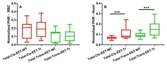 In the biological samples, peak height of each analyte was normalized to the corresponding peak height of internal standard. Levels of each cis-EET regioisomer were quantified using a standard curve, while levels of trans-EETs were determined using normalized peak height ratios (PHR). In addition to analyte normalization to the corresponding internal standard, the amount or ratio of peak heights for each analyte were normalized to total protein content for erythrocyte membrane and cardiac tissue. Since only one fifth of the heart homogenate was used for each sample, the amount or ratios of peak heights of each analyte were multiplied by five to scale for the entire heart.