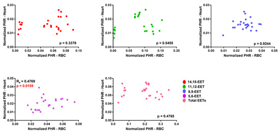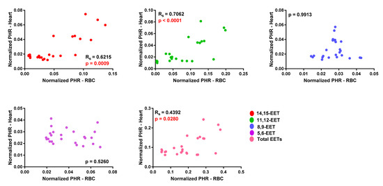 Correlation of each cis-epoxyeicosatrienoic acid (EET) regioisomer and total cis-EETs in erythrocyte membrane and cardiac tissue of wild-type mice. Relative amount of each regioisomer of EETs was represented by normalized peak height ratio peak height ratio (PHR) in erythrocyte membrane or cardiac tissue.