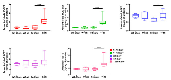 Levels of cis-epoxyeicosatrienoic acid (EET) regioisomers and total cis-EETs extracted from erythrocyte membrane of wild-type (WT) and transgenic (Tr) mice subjected to sham or myocardial infarction (MI) surgery. Eight WT mice (4 female (F) and 4male (M) mice) and nine Tr mice (4 F and 4 M were subjected to sham surgery, and 9 WT mice (4 F and 5 M mice) and nine Tr mice (4 F and 5 M mice) were subjected to MI surgery. * indicates p ≤ 0.05 and **** indicates p ≤ 0.0001.