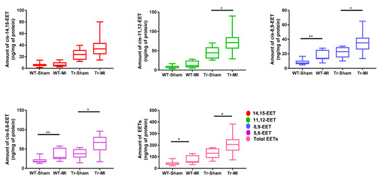 Cis-epoxyeicosatrienoic acid (EET) regioisomers and total cis-EET levels extracted from cardiac tissue of wild-type (WT) and transgenic (Tr) mice subjected to sham or myocardial infarction (MI) surgery. Eight WT mice (four female (F) and four male (M)) and nine Tr mice (five F and four M) were subjected to sham surgery and nine WT mice (four F and five M) and nine Tr mice (four F and five M) were subjected to MI surgery. * indicates p ≤ 0.05 and ** indicates p ≤ 0.01.