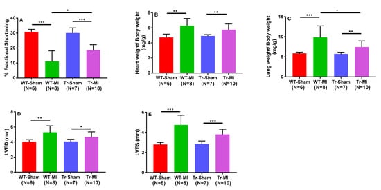 Echocardiographic measurement of ventricular function following myocardial infarction (MI). (A) Percentage fractional shortening (%FS), an indicator of contractile function of the left ventricle; (B) heart weight to body weight (HW/BW) ratio; (C) lung weight to body weight (LW/BW) ratio; (D,E) measurement of the left ventricle dimensions at the end of diastole (the biggest cardiac dimension, LVED, D) and systole (the smallest cardiac dimension, LVES, E) in mice subjected to sham or MI surgery. * Indicates p < 0.05, ** p < 0.005, *** p < 0.0005.
