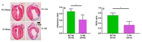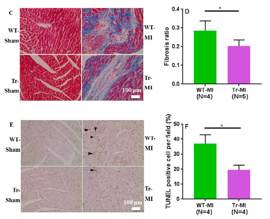 Paraffin-embedded cardiac sections of WT and Tr mice were stained using Masson’s Trichrome (A,C). (A) Shows whole slice of hearts, while (C) shows only infarct zones. Blue area indicates myocardial fibrosis, while red area indicates healthy muscle tissue. (B) Myocardial infarction size ratio and (D) myocardial fibrosis ratio were determined using MetaMorph 6.1 software. (E) Terminal Deoxynucleotidyl Transferase dUTP Nick End Labelling (TUNEL)-positive nuclei of paraffin-embedded sections from the mice hearts indicated in (A). Apoptotic cells appear brown, while normal cells appear blue. (F) Measurement of TUNEL-positive nuclei in cardiac sections from mice indicated in (A). (G) Measurement of reactive oxygen species (ROS) ratio using chloro methyl- 2’,7’-dichlorodihydrofluorescein diacetate (CM-H2DCFDA) staining from mice frozen cardiac sections. * Indicates p ≤ 0.05.