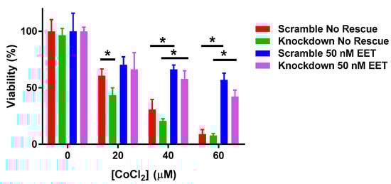 Cell viability in human adult-derived ventricular myocytes exposed to varying doses of CoCl2 for 24 h, following 72 h of lipofectamine treatment with either scrambled siRNA or CYP2J2 siRNA and addition of 50 nM total EETs prior to CoCl2 treatment. * Indicates p < 0.05.