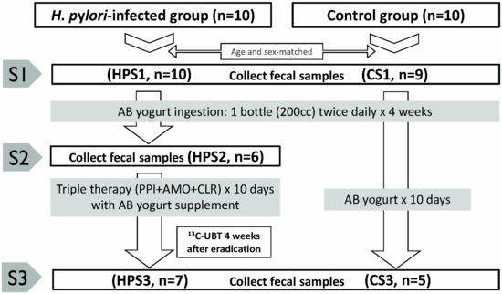 The numbers of subjects and fecal samples at enrollment, on the 4th week, and 4 weeks after triple eradication therapy. CS1: non-H. pylori infected controls at enrollment; CS3: non-H. pylori infected controls 4 weeks after yogurt ingestion; HPS1: H. pylori-infected children at enrollment; HPS2: H. pylori-infected children after 4 weeks of yogurt ingestion; HPS3: H. pylori-infected children 4 weeks after eradication therapy.