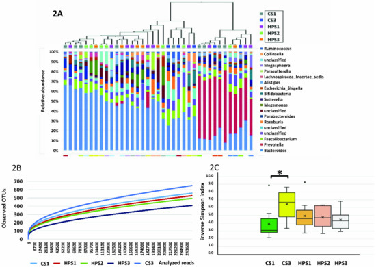 The dendrogram of hierarchical clustering and microbiota composition at the genus level in the 37 fecal samples (A). The rarefaction curves (B) and inverse Simpson index (C) of microbiota between the five groups (CS1: non-H. pylori infected controls at enrollment; CS3: non-H. pylori infected controls 4 weeks after yogurt ingestion; HPS1: H. pylori-infected children at enrollment; HPS2: H. pylori-infected children after 4 weeks of yogurt ingestion; HPS3: H. pylori-infected children 4 weeks after eradication therapy. * p < 0.05.
