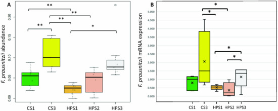 Figure 3A shows the serial changes in the abundance of F. prausnitzii in the five groups. In addition to a significant reduction in the H. pylori-infected children (HPS1) compared to the controls (CS1), probiotics-containing yogurt ingestion significantly increased the proportion of F. prausnitzii in the non-H. pylori infected children (0.11 vs. 0.05, p = 0.003). However, this increase was diminished in the H. pylori-infected group after yogurt ingestion (0.04 vs. 0.02, p = 0.11). Moreover, the mean proportional abundance of F. prausnitzii in the H. pylori-infected children with successful eradication was significantly increased compared to that before yogurt ingestion and eradication (0.10 vs. 0.02, p = 0.0005). The abundance level of F. prausnitzii after H. pylori eradication was comparable to that of the non-infected level. Real-time PCR quantification confirmed the increase in the abundance of fecal F. prausnitzii in the samples (Figure 3B).