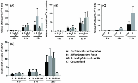 Lactobacillus acidophilus and Bifidobacterium lactis promote F. prausnitzii growth in vitro and in ex vivo. All relative DNA level were calculated by tested value/the 4th h control value. The L. acidophilus and B. lactis were sub-cultured in BHIS broth and incubated until the bacterial density reached OD ≥ 0.5 (5 × 107/μL). Then 100 μL of culture media was added in 5 mL RPMI-1640 (A) or 20 μL in 1 mL cecum fluid (B) and incubated for 24 h. After filtration, 100 μL of supernatant was added in 30 mL YCFA broth with F. prausnitzii (APC 918/95b) co-cultured for 4, 8, and 12 h. (C) F. prausnitzii cultured in YCFA with BHIS or cecum fluid only. (D) The equal-sized cecum tissue was co-cultured with 3 mL RPMI medium with or without L. acidophilus and B. lactis for 24 h. The 100 μL supernatants was added in 30 mL YCFA broth with F. prausnitzii co-cultured for 4, 8, and 12 h. The relative abundance of F. prausnitzii were measured as the percentage of total bacteria DNA copy numbers by real-time PCR. All tests were triplet.