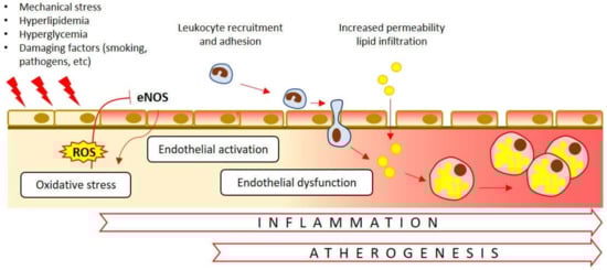 Endothelial dysfunction in atherosclerosis. Oxidative stress causes inhibition (T-bar) of the endothelial nitric oxide synthase (eNOS). Dysfunctional eNOS, in turn, further contributes to ROS formation (arrows). A number of other internal and external damaging factors impact the endothelial cells. Activation of the endothelial cells is associated with recruitment and adhesion of the immune cells, their penetration into the subendothelial space and initiation of the inflammatory response. Increased permeability of dysfunctional endothelium facilitates lipid entry into the arterial wall.