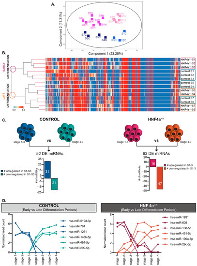 Analysis of the miRNAome during differentiation. (A) PCA plot of the conditions analyzed. (B) Hierarchical clustering of normalized miRNA expressed during the first seven stages of differentiation in HNF4α+/Δ and control-derived cells. (C) Number of miRNAs differentially expressed between early (S1–3) and late differentiation (S4–7) in either control- (left) or HNF4α+/Δ −derived cells (right), n = 1–6 samples per stage. (D) Selected representative RNAs’ regulation patterns. Graphs’ data are given as mean ± SD.