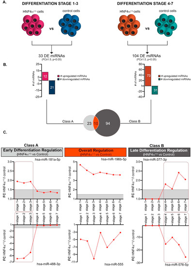 To focus on the miRNA landscape changes caused by the HNF4α+/Δ mutation, we subsequently selected miRNAs exhibiting significant global differences between HNF4α+/Δ (MODY1) patients and their corresponding healthy controls during: (1) early (Class A, Table S1) or (2) late stages of differentiation (Class B, Table S1) (Figure 3A). We considered only the miRNAs having a normalized level of expression of at least 1 in at least one condition of the comparison. Class A consisted of 33 differentially expressed miRNAs (DEmiRs) between HNF4α+/Δ and control-derived cells (Figure 3B,C). Almost two thirds of these (63.63% 21/33) were downregulated in the mutation carrier cells (i.e., presenting higher expression in the control-derived samples). Of note, during late differentiation (Class B), there were three times more miRNAs deregulated as a consequence of HNF4α+/Δ mutation (3.15x, 104 vs. 33) (Figure 3B,C). Moreover, in contrast with the previous condition, these were largely upregulated (70.19% 73/104), indicating that, at later stages during differentiation, the mutation is either inducing miRNA production or impedes mechanisms involved in their degradation (Figure 3B). Finally, ten miRNAs were significantly regulated between the HNF4α+/Δ mutation and control during both periods (i.e., all along the differentiation timeline, Figure 3B,C).