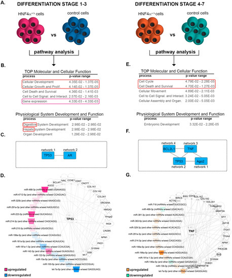 Pathway analysis of the differentially expressed miRNAs between the HNF4α+/Δ mutation and control cells. (A) Experimental design of the condition pairs compared. (B) IPA-generated tables of the top molecular and cellular function (developmental cellular processes are marked by the red box, gene expression by purple box) and physiological system development and function for the differential miRNA landscape during the early differentiation period (red box marks the endocrine development signature). (C) IPA-generated overlapping networks. (D) IPA-generated network. (E) IPA-generated tables of the TOP molecular and cellular function and physiological system development and function for the differential miRNA landscape during the late differentiation period (proliferation /survival cellular processes are marked by the red box). (F) IPA-generated overlapping networks. (G) IPA-generated network.