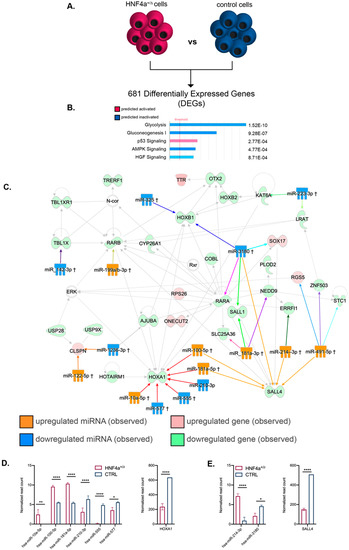 Pathway analysis of the mRNA–miRNA landscapes during the early differentiation period. (A) Experimental design. (B) IPA-generated top canonical pathways (absolute value z-score > 1) (C) miRNA–mRNA interactions of the top transcriptional landscape network. (D) Expression levels of miRNAs targeting the HOXA1 node and its respective expression level at stage 3 (n = 3 samples for controls; n = 6 samples for HNF4α+/Δ). (E) Expression levels of hsa-miR-214-3p and hsa-miR-3180 and their target SALL4 expression at stage 3 (n = 3 samples for controls; n = 6 samples for HNF4α+/Δ). Graphs data are shown as mean and SD. * p < 0.05, ** p < 0.01, **** p < 0.0001 (Mann–Whitney test).