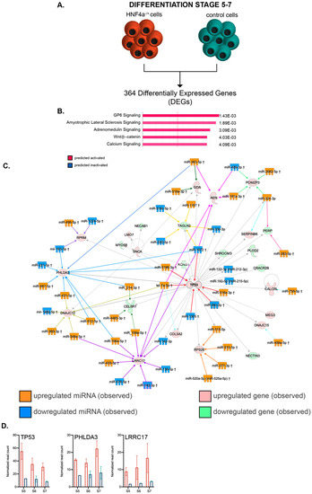 We subsequently used IPA and combined the miRNA and their corresponding gene targets differentially expressed between HNF4α+/Δ and control samples during the early differentiation window. Due to the large amount of data generated, for this study we focused on the top regulatory network characterizing the analyzed landscape (Figure 5C).