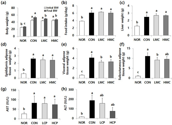 Effects of two skate skin-derived collagen peptides with different molecular weights on body weight (a), food intake (b), organ weight (c–f), and aminotransferase activity (g,h). Data are mean ± standard deviation (SD) (n = 10 per group). Experimental groups were divided into four groups; m/m mice were orally administered water as a vehicle (NOR group) whereas db/db mice were orally administered water (control group, CON), LCP (LCP group), or HCP (HCP group) at a dose of 200 mg·kg bw−1·day−1 for 8 weeks. a–c Different letters mean significant differences to one-way analysis of variance (ANOVA), followed by Duncan’s multiple-range test at p < 0.05.