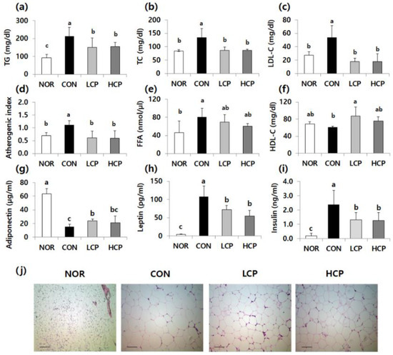 Effects of two skate skin-derived collagen peptides with different molecular weights on plasma lipid (a–f), adiponectin (g), leptin (h), and insulin levels (i), and lipid droplets in adipose tissue (j). Data are mean ± standard deviation (SD) (n = 10 per group). Experimental groups were divided into four groups; m/m mice were orally administered water as a vehicle (NOR group) whereas db/db mice were orally administered water (control group, CON), LCP (LCP group), or HCP (HCP group) at a dose of 200 mg·kg bw−1·day−1 for 8 weeks. a–c Different letters mean significant differences to one-way analysis of variance (ANOVA), followed by Duncan’s multiple-range test at p < 0.05. The atherogenic index (AI) was calculated as (TC - HDL-C) / HDL-C. Histological analysis of adipose tissue was performed using hematoxylin and eosin staining, magnification: 200×, bar: 50 μm.