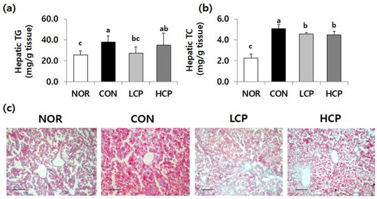 Hepatic TG and TC levels that were elevated in db/db mice were significantly decreased in collagen-fed groups (Figure 3a,b, p < 0.05). Compared to the CON group, the hepatic TG level in the LCP group was lower by 28.1% and hepatic TC levels in the LCP and HCP groups were reduced by 10.5% and 11.8%, respectively (p < 0.05).