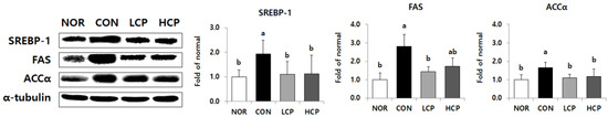 Compared to the CON group, protein expression levels of SREBP-1 were significantly lower in the LCP and HCP groups by 42.8% and 41.6%, respectively, which was similar to that in the normal (NOR) group mice (Figure 4, p < 0.05). As expected, protein expression levels for FAS were significantly lower in the LCP group by 48.6%, and those for ACCα were significantly reduced in the LCP and HCP groups by 32.5% and 29.2%, respectively (p < 0.05).