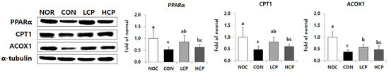 Protein expression levels of PPARα were significantly elevated in the LCP group by 163.6%, compared to that in the CON group (Figure 5, p < 0.05). Similarly, protein expression levels of CPT1 and ACOX1 in the LCP group were higher by 168.5% and 153.9%, respectively (p < 0.05).