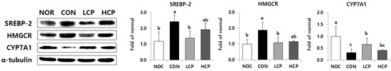 Compared to the CON group, the protein expression levels of cholesterol metabolism were significantly different only in the LCP group. The levels of SREBP-2 and its target gene, HMGCR, in the LCP group were significantly lower by 42.7% and 42.1%, respectively (Figure 6, p < 0.05). In contrast, protein expression of microsomal cytochrome P450 family 7 subfamily A member 1 (CYP7A1) in the LCP group was significantly elevated by 108.2% (p < 0.05).