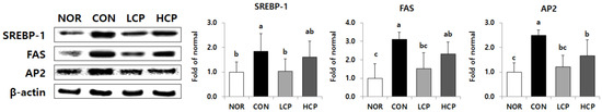 Compared to the CON group, protein expression levels involved in lipogenesis were significantly different only in the LCP group (Figure 7). The levels of SREBP-1, FAS, and AP2 in the LCP group were significantly lower by 43.7%, 51.0%, and 49.8%, respectively (p < 0.05).