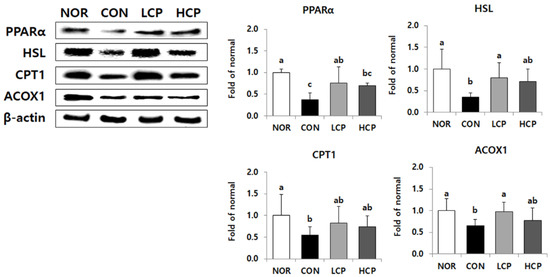 Protein expression levels of PPARα in the LCP and HCP groups were significantly higher by 103.1% and 86.0%, respectively, compared to those in the CON group (Figure 8, p < 0.05). Protein expression levels of HSL and ACOX1 were significantly higher (by 110.9% and 120.1%, respectively) only in the LCP group (p < 0.05). Although the CPT1 level was elevated by collagen intake, there was no significant difference among db/db mice.