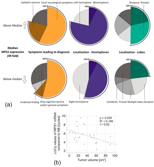 Association of MPS1 mRNA expression with GBM-patients’ symptoms, tumor localization, and tumor volume. (a) Pie charts of the reason for initial hospitalization and tumor localization of GBM patients with MPS1 mRNA expression below and above the median expression (49-fold). Shown is the percentage of patients belonging to each group. (b) Scatter diagram of MPS1 mRNA expression compared to the GBM tumor volume. Linear regression, p-values were calculated by ANOVA based on ΔΔCq-values. The global effect size was determined by Cohen’s f.
