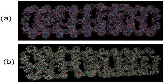 RNA nanotube made from 10 nanorings for all-atom Visual Molecular Dynamics (VMD) simulations in (a) and for coarse-grained VMD simulations under 3 bead approximations in (b). Evidently, in coarse-grained model in (b), the number of atoms are significantly reduced, which facilitates the calculations for analysing physical properties of RNA nanotubes.