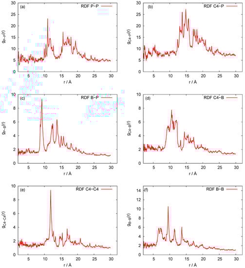 Our three-bead approximation is a development of our earlier model for the nanoring [28], where we adopted a representation with three beads per nucleotide that corresponds to the (P)hosphate, (S)ugar and nucleic (B)ase, respectively. It is a natural choice for nucleic acids. In Figure 2, we present the P-P radial distribution function for the RNA nanotube with five rings and the RDFs of the corresponding CG model. Here all-atom RDFs are taken from the trajectories that were calculated with representative statistical ensembles for relatively short simulation times, whereas for the CG model the simulation was performed for the 200 ns. The natures of the P-P RDF plots obtained with these two models were quite different because different numbers of atoms were assembled in the cases of all-atom and coarse-grained MD simulations of the nanotubes. In Figure 3, we present the radial distribution function of 10-ring RNA nanotube under CG model approximations. More specifically, in Figure 3a–f, we present the following characteristics of this RNA nanotube: the radial distribution functions for P-P, C4-P, B-P, C4-B, C4-C4, and B-B atoms, respectively. The peaks in RDF plots provided the distance between the considered beads used to produce the coarse-grained model structure of the RNA nanotube. As expected, such peaks were highest for P-P and C4-P atoms. The approximate distances observed in these plots were also used to self-assemble the RNA nanorings to build RNA nanotube structures of large sizes.