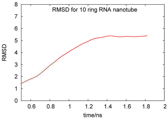 In Figure 4, we plot the root mean square deviation (RMSD) vs. time, given in units of ns, for the 10-ring RNA nanotube. As mentioned earlier, the length of such a nanotube was 40 nm. From the RMSD plot of this nanotube, we can see that the value of RMSD increased at the beginning of the simulation and then reached a constant value, indicating that the system reached an equilibrium. In Figure 5, we have presented the results for the phosphorous-phosphorous radial distribution functions of 1, 4, 5, and 10 ring RNA nanotubes. Here we see that the intensity of the radial distribution functions decreased with the increasing number of RNA nanorings in the nanotube, which also indicates that the nanotube may be modeled by discrete-to-continuum type models recently developed by our group [34,54,55].