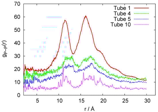 P-P Radial distribution functions for the coarse-grained models of 1-, 4-, 5-, and 10-ring RNA nanotube.
