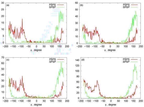 In Figure 6, we plot histograms for the bond angles between PSP and SPS beads for the RNA nanotubes of different sizes. Evidently, the bead angles for PSP and SPS were different for different sets of beads. In particular, the highest peak was progressively increasing when we increased the number of rings in the nanotube. Furthermore, by using the three-bead approximation, we also plot the histograms for the dihedral angles for different sizes of the nanotubes in Figure 7. From these histograms, we see that the peaks for PSPS dihedral angles were found at around degree for all RNA nanotubes. On the other hand, for the SPSP dihedral angles, the peaks were found to be around 150 degrees. The histogram peaks at different angles for PSPS and SPSP dihedral angles described different backbone configurations of the RNA nanotubes. As expected, the highest peak increased with an increase in the number of rings in the nanotube.