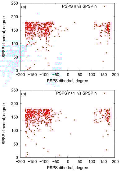In Figure 8, we plot bead distances for P-C4 (phosphate—sugar ring) and C4-B (sugar ring—nucleobase) of two-ring RNA nanotube in the three-bead approximation of the coarse-grained model. In this plot, for a particular structure, the distances of the beads are plotted as a function of the residue index along the RNA strands of RNA nanotubes. It is clear that the distances remain almost constant with some fluctuations due to the damping of the system. Furthermore, in order to describe the three-bead coarse-grained structure, we have presented the two-dimensional maps for the dihedral pair distributions of two-ring RNA nanotube in Figure 9. These plots are similar to the plots described in Ref. [56]. The RNA conformation classes are described based on the two-dimensional plots of dihedral angle pair distributions. The conformation classes, that were separable from the majority of other such classes, corresponded to the kissing loop as mentioned in reference [28]. In the case of the two-ring nanotube, we see that the numbers of points in the two-dimensional plots were differently distributed in the plane. Some points in the plane were densely populated, whereas some were sparsely populated. The densely populated region of the plot corresponded to the area of interest because it possesseed significant classes of RNA conformations. In the two-dimensional plot for the two-ring RNA nanotube, we found that the maximally dense population of the points was around (165, 150). Furthermore, we found that the two-dimensional plots of dihedral angle pair distributions for the four-, five-, and 10-ring RNA nanotubes were in the vicinity of the same region for the two-ring RNA nanotube.