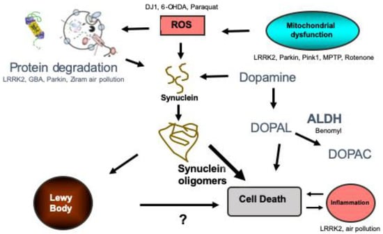 Neuroinflammation (i.e., microglial and astrocyte activation) also appear to be a factor in the pathogenesis of PD [35,36,37]. Microglia are the resident immune cells of the CNS and play key roles in tissue repair and cellular homeostasis [38]. Inflammatory changes may cause injury, protect against it, or simply reflect neuronal injury [36,38,39,40]. Recent studies support a contributing role of inflammation to neuronal damage [37,40]. It is clear that inflammatory changes (microglial and astrocyte activation) are found in PD brains [40], and genetic alterations in several immune function-related genes (e.g., DJ-1, leucine-rich repeat protein kinase-2 (LRRK2), and HLA-DR) can alter the risk of developing PD [41,42].